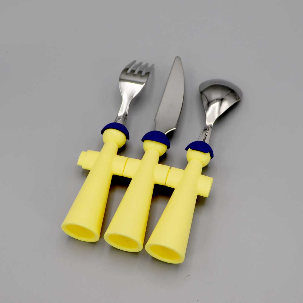 Couverts enfant en inox et résine avec un manche de couleur jaune en forme de bonhomme et qui s’imbriquent en se donnant la main.