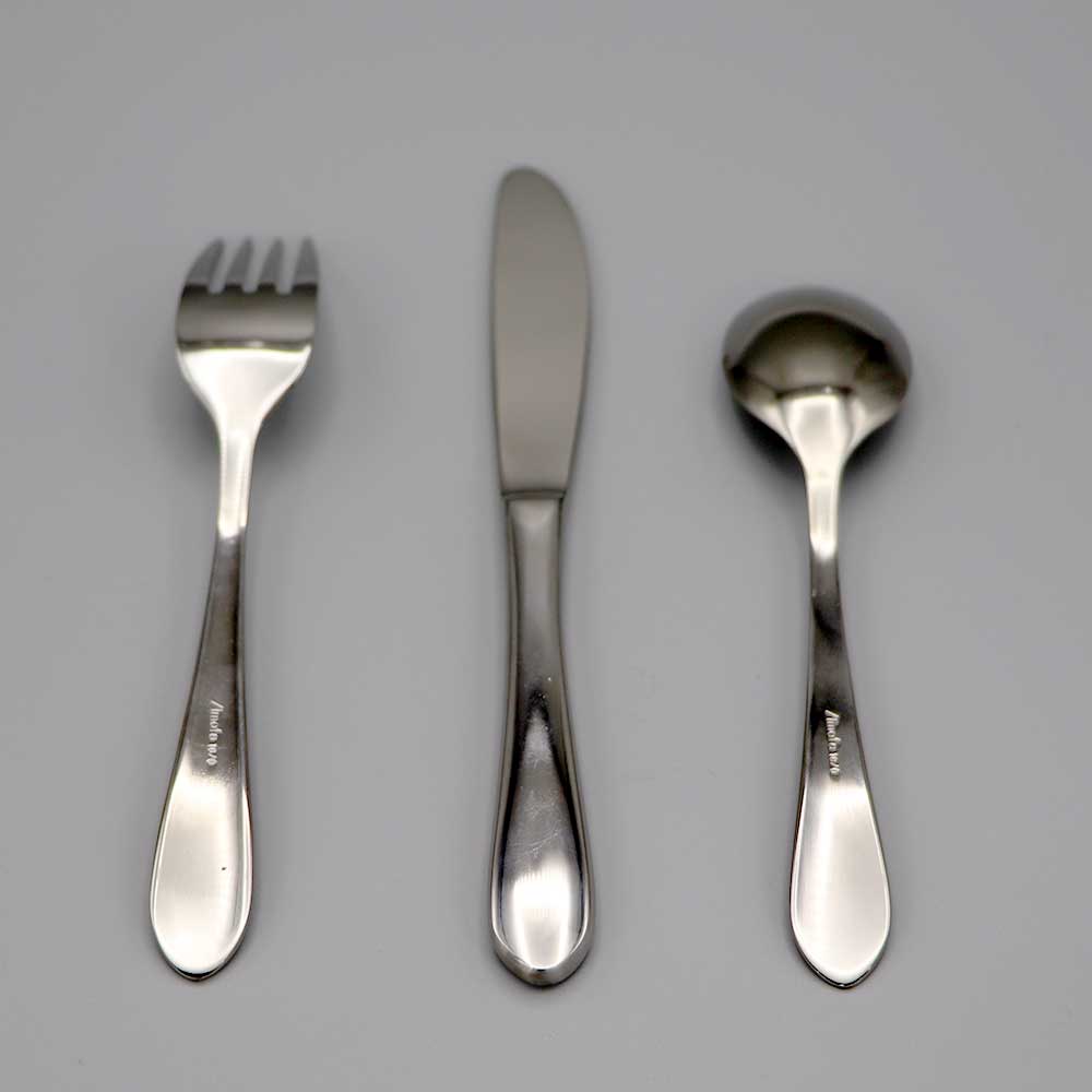 Set couvert enfant 3 pièces : cuillère enfant en inox 15 cm, fourchette enfant en inox 15 cm et couteau en inox.