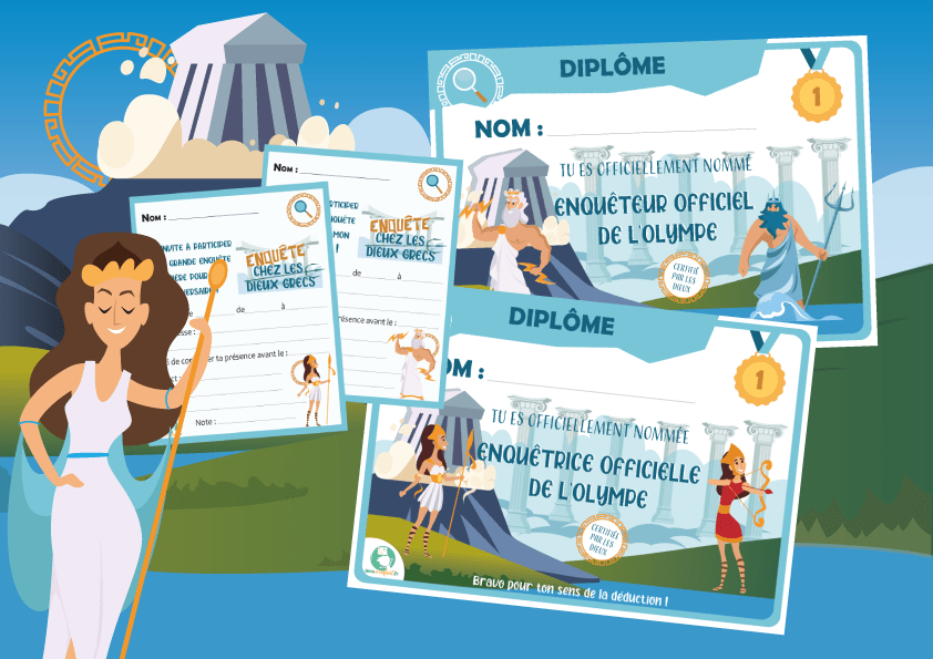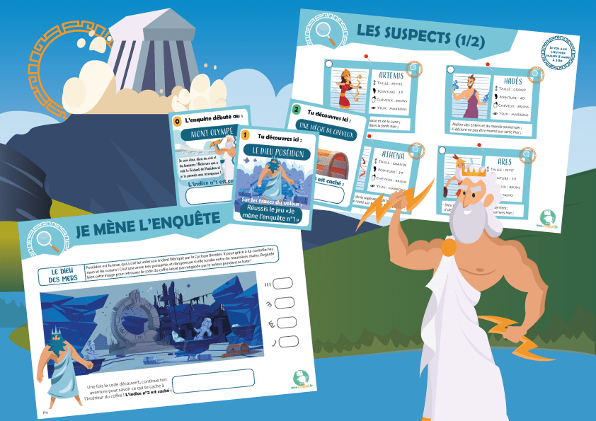 Dans cette énigme policière sur le thème de la mythologie grecque, faites découvrir à vos enfants l’univers passionnant des dieux grecques de manière totalement ludique. Lancez-vous et téléchargez un kit d’enquête complet pour une fête d’anniversaire, une activité en famille, ou une animation scolaire !