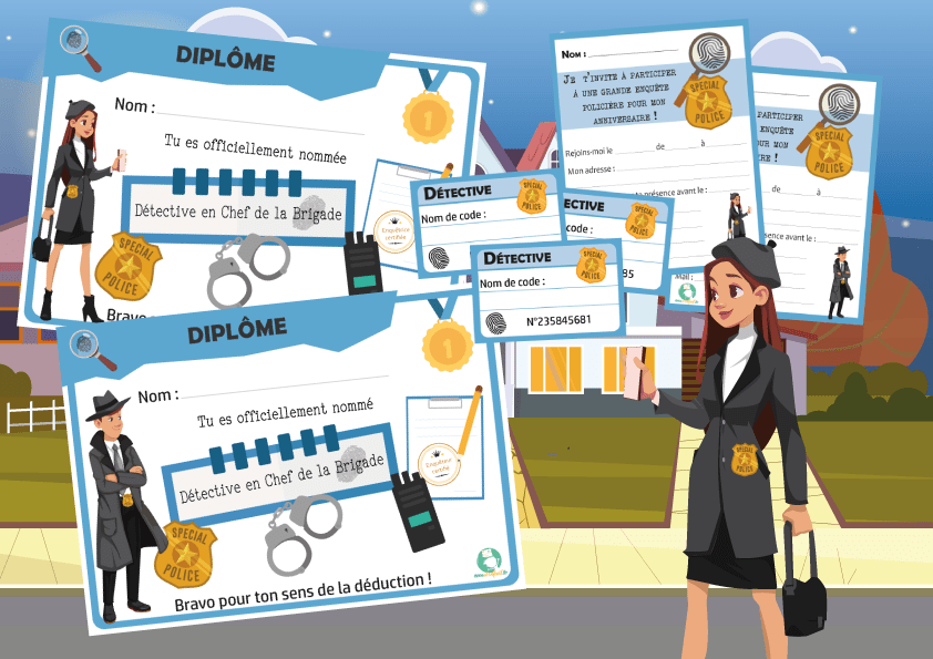 A noter : Ce kit d’enquête policière pour enfant à imprimer nécessite également l’organisation et la présence d’un adulte pour son bon déroulement. Nous vous conseillons de très bien cacher les indices dans les différents lieux de la maison pour la recherche et pour un temps de jeu plus long.