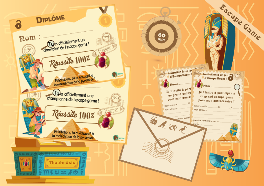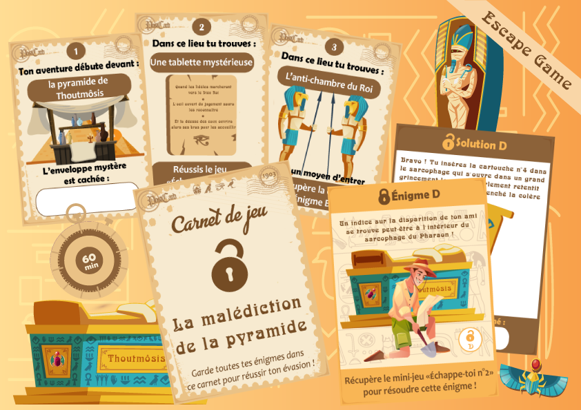 A noter : Cet escape game sur le thème de l’Égypte Antique pour enfant nécessite également l’organisation et la présence d’un adulte pour son bon déroulement. Nous vous conseillons de très bien cacher les indices dans les différents lieux de la maison pour la recherche et pour un temps de jeu plus long.
