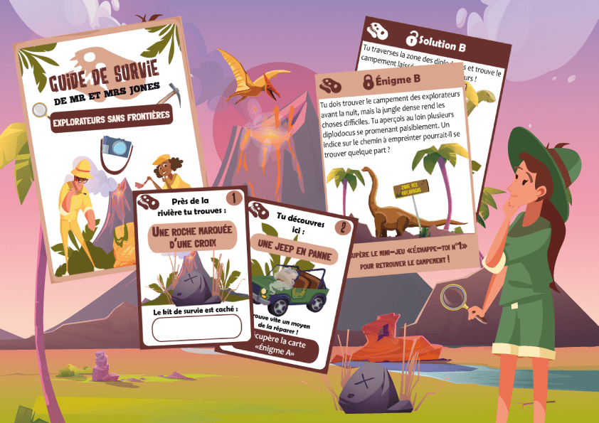 Notre kit de jeu d’escape game sur le thème des dinosaures et de l’aventure est en couleur, et doit donc être imprimé en couleur pour le bon fonctionnement des énigmes.