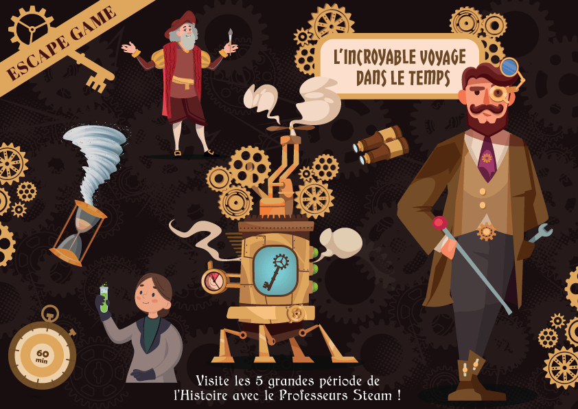 Ton aventure commence lorsque ton ami, le Professeur Steam, te demande de le rejoindre de toute urgence dans son nouveau laboratoire de Sciences et Voyages. En arrivant, tu découvres le professeur survolté, devant une machine pour le moins étrange. À bout de souffle, il marmonne qu’il a créé un prototype de machine à voyager dans le temps, devenue incontrôlable suite à la perte de la clé d’arrêt d’urgence dans le passé ! Un bug temporel à en effet fragmenté la clé en 4 éléments distincts, qui se sont ensuite éparpillés à différentes périodes de l’Histoire. Quelqu’un doit absolument traverser les époques et la retrouver avant la fermeture du vortex spatio-temporel dans 60 minutes !
