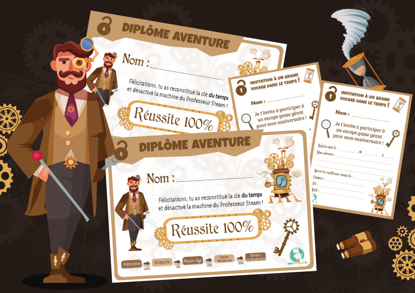 Retrouveras-tu la clé d’arrêt d’urgence de la machine à voyager dans le temps du Professeur Steam ? Découvrez un escape game maison pour enfants sur le thème du voyage dans le temps. Laissez-les profiter d’un moment ludique et éducatif pour une fête d’anniversaire, un goûter entre copains, ou tout simplement pour une activité en famille. Proposez une aventure hors du commun et laissez entrer l’aventure dans votre maison !
