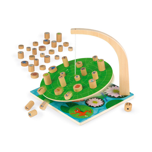 Chaque joueur doit choisir puis placer un animal/insecte sur le nénuphar sans le faire basculer ! Attention, la partie est perdue si les pions tombent ! Il faut être habile et tactique pour survivre dans la mare ! Ce jeu développe l’adresse et la concentration ! Le plateau en bois est surmonté d’un nénuphar et de 42 pions de tailles différentes. De 2 à 6 joueurs. Règles du jeu en français, anglais, allemand, néerlandais, espagnol et italien. Plateau : 22 x 22 x 1 cm. Nénuphar : 21,5 x 21,5 cm.
