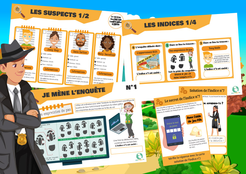 Nos jeux d’enquête policière enfant sont en couleur, et doivent donc être imprimés en couleur pour le bon fonctionnement des énigmes.
