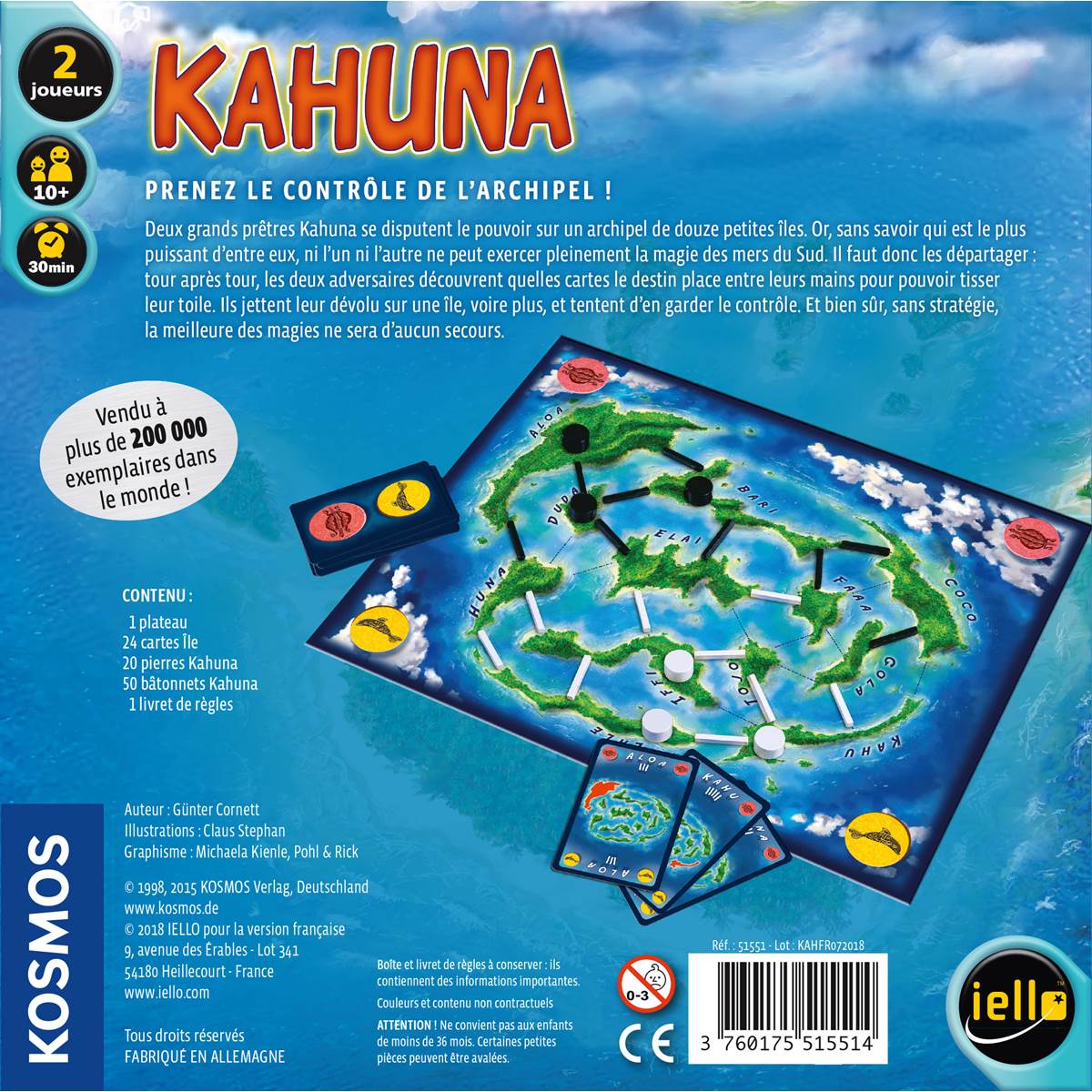 1 plateau avec 12 îles reliées entre elles par des pointillés, 50 bâtonnets Kahuna, 20 pierres Kahuna et 24 cartes Île.