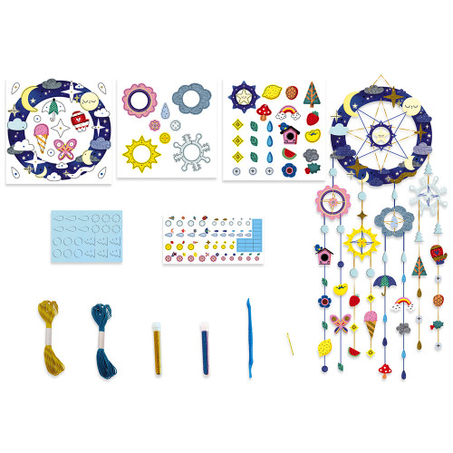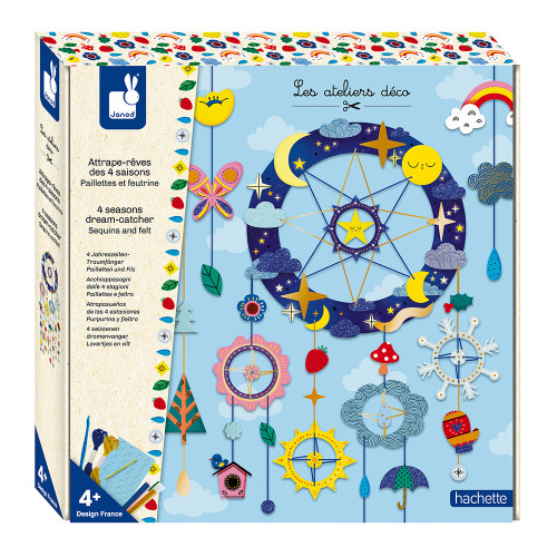 Ce joli attrape-rêves sur le thème des 4 saisons sera parfait pour décorer une chambres. Pour cela, il suffit de le monter en suivant les pas à pas du livret d’instructions puis de le customiser avec les autocollants et les paillettes. Ce coffret contient : 3 cartes prédécoupées, 2 tubes de paillettes, 1 planche de feutrine, 4 mètres de fil bleu, 4 mètres de fil doré, 1 planche d’autocollants, 1 aiguille en plastique, 1 outil en plastique et 1 livret avec modèles et instructions.