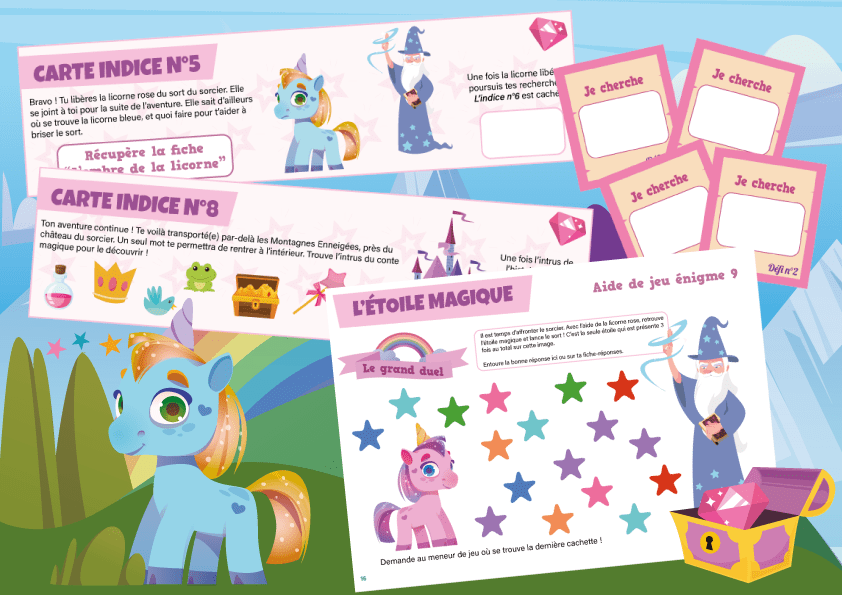 Dans cette chasse aux trésors licorne, un terrible sorcier du royaume des Montagnes Noires vient de dérober le diamant magique des nos petites licornes. Une chasse au trésor s’impose pour retrouver au plus vite ce trésor magique !
