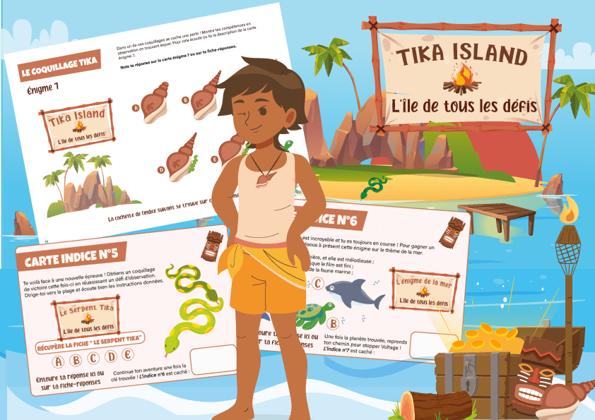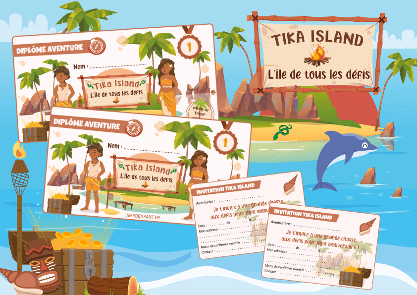 Bienvenue sur l’île aux défis de Tika Island ! Rejoins vite l’île en bateau pour participer à une grande chasse aux défis, avec à la clé une jolie récompense et un diplôme du plus grand(e) aventurier(ière) de l’île Tika !Une chasse au trésor thème île et aventure pour tous vos petits aventuriers en herbe !