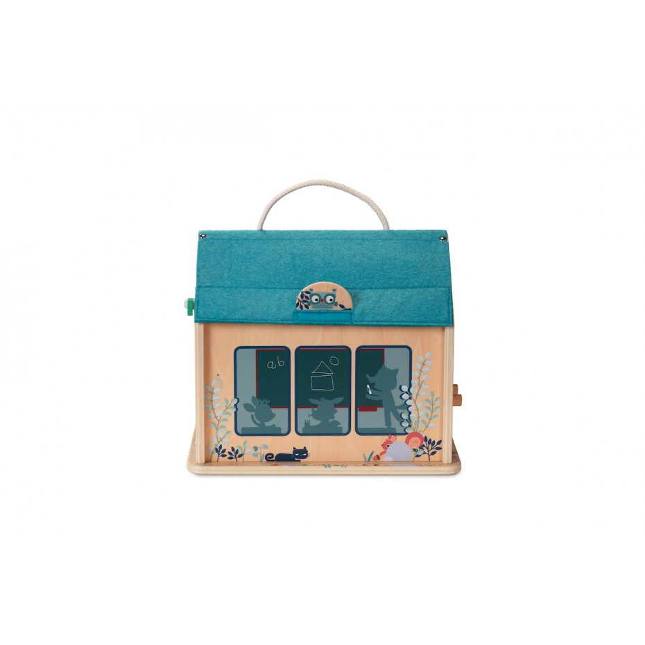 Le toit de l’école s’ouvre et dévoile alors une salle de classe pleine de surprises et de jeux à se raconter. Un emplacement est prévu pour le tableau où l’enfant pourra changer les notions étudiées (3 planches recto-verso). Un mini boulier ainsi que des formes à déplacer sont présents dans la classe tout comme une petite clochette sonnant la récréation. Une fois l’heure de la pause sonnée, un pan de mur peut se retirer et ainsi révéler la cour de récré. Joe et Stella peuvent alors poser leur cartable et leur carnet de liaison pour aller s’amuser et jouer à la marelle. Une multitude d’autres détails colorés sont à découvrir sur les pans de murs ou à l’intérieur de la classe. L’ensemble des pièces qui composent ce jouet peuvent être rangées à l’intérieur de Ma Première École Lilliputiens, et l’anse dont elle est pourvue permet de l’emmener partout, facilement.