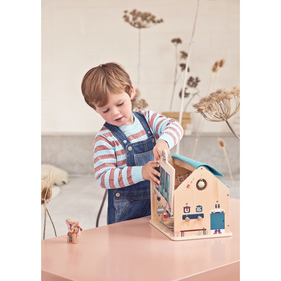 Ce jeu d’éveil est fait de bois et feutrine et mesure 27 x 20 x 22,5 cm. Il est idéalement adapté pour l’enfant dès 2 ans.
