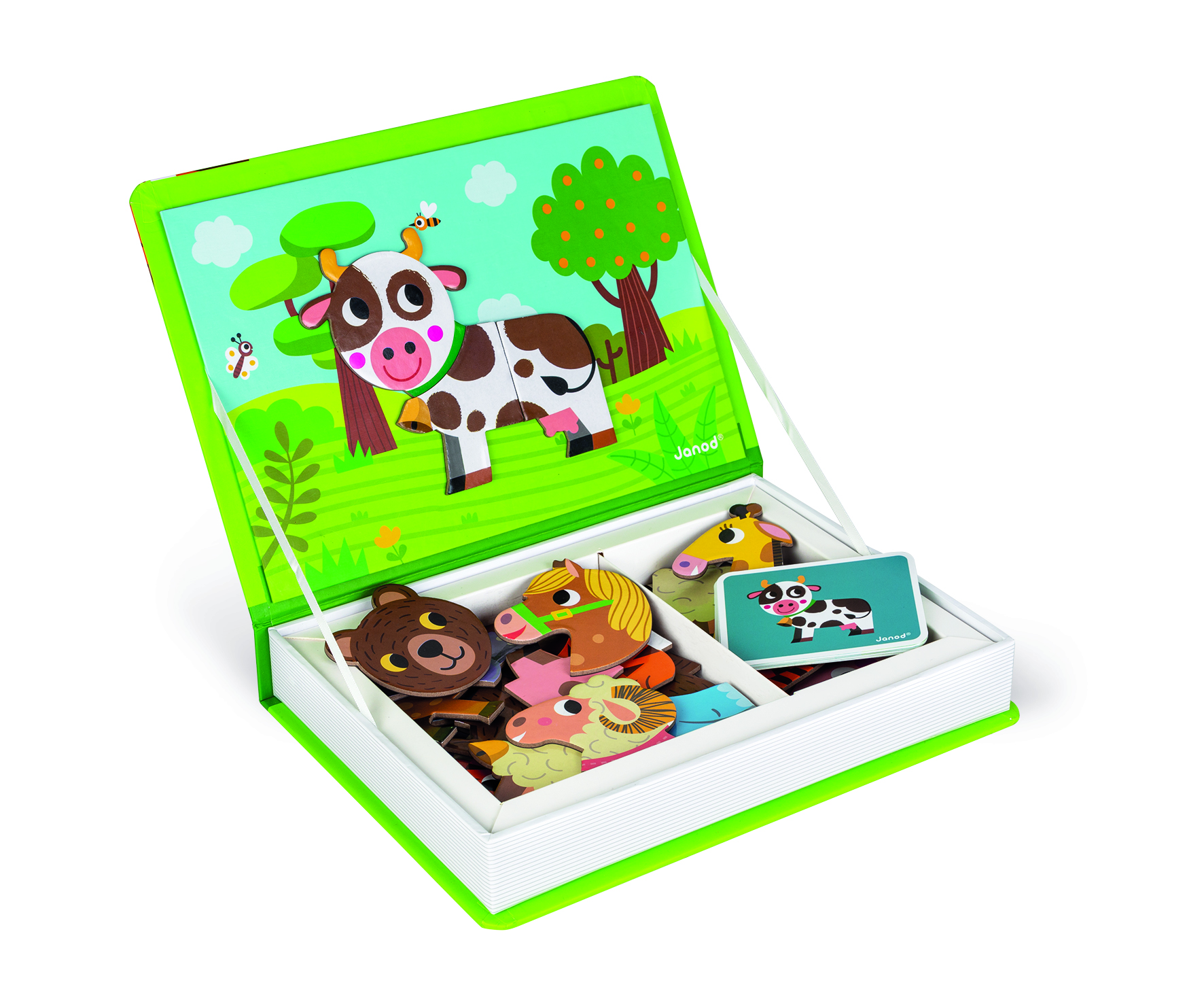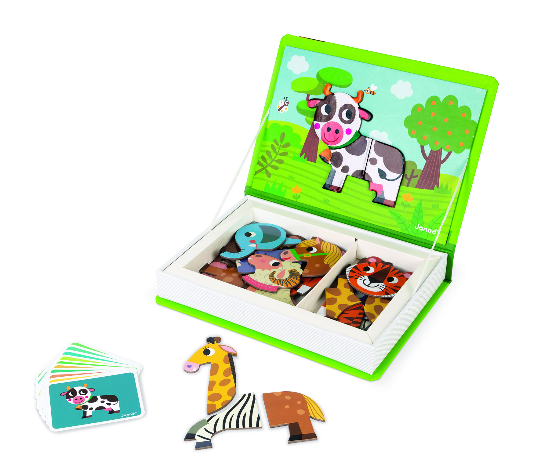 Un zoo entier dans une petite boîte ! Le Magnéti’book animaux contient 30 magnets pour donner vie à beaucoup d’animaux. Super pratique grâce son format livre : il suffit à votre enfant de l’ouvrir pour trouver les aimants ainsi que les 10 cartes modèles et la face magnétique sur laquelle assembler les magnets. Le but du jeu est simple, recomposer sur la scène magnétique l’animal indiqué sur la carte modèle ou laisser parler son imagination pour créer des animaux loufoques et drôles car chaque pièce est compatible avec les autres ! Parmi les animaux à recréer il y a le cheval, le rhinocéros, la girafe, le zèbre, l’ours, le mouton… Grâce à sa boîte pratique, vous pourrez collectionner tous les Magneti’book, les ranger dans une bibliothèque et les emporter partout pour occuper vos enfants dès 3 ans au restaurant ou sur le trajet des vacances ! Ce produit est composé de matériaux certifiés FSC® et de matériaux contrôlés.