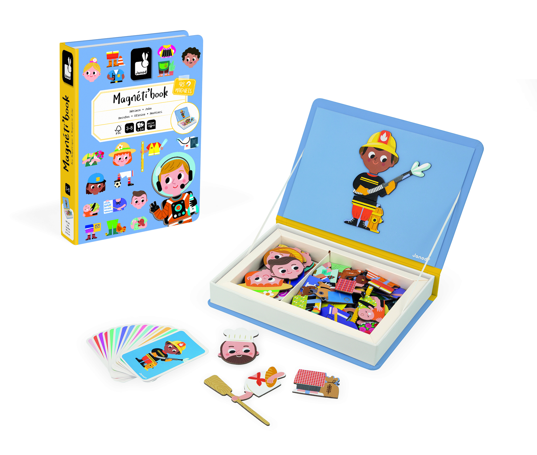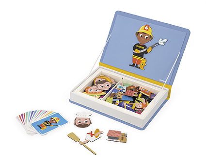 Et si on jouait à inventer des métiers ? Quelle sera l’association la plus étonnante créée par les enfants ? Avec ce Magnéti’Book dédié aux métiers, les enfants à partir de 3 ans vont pouvoir découvrir 16 professions mais également en imaginer plein d’autres ! Les Magnéti’Books sont des coffrets aimantés renfermant de nombreux magnets à positionner sur une surface magnétique. Dans un premier temps, les enfants peuvent s’amuser à reconstituer les cartes modèles en retrouvant les bons éléments et en les plaçant au bon endroit. Ensuite, ils pourront laisser parler leur imagination et créer leur propres mélanges de métiers en mixant les aimants ! Pratique, le coffret se referme facilement et contient les 48 magnets et 16 cartes du jeu, pour être transporté partout ! Ce jeu éducatif magnétique est fabriqué en carton FSC®.
