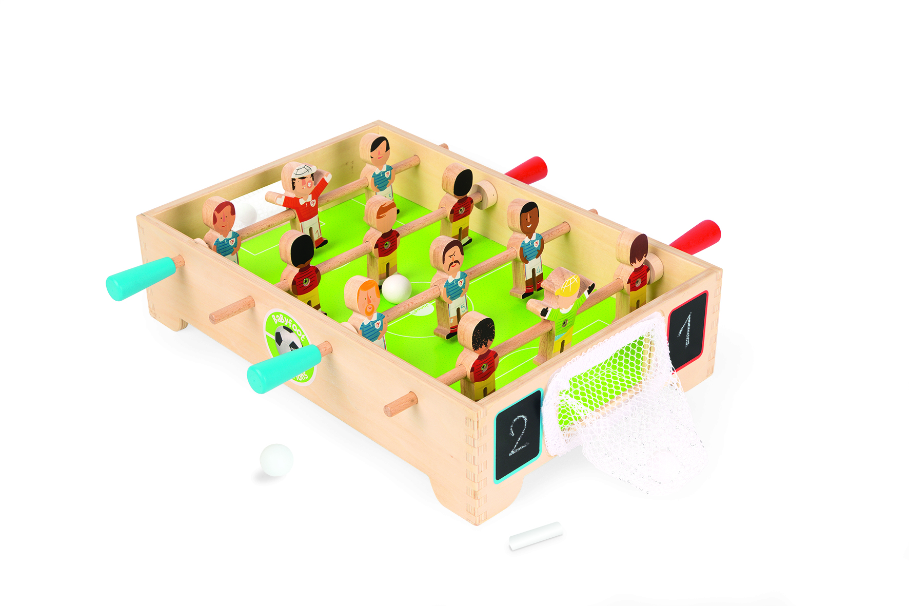 Deviens le meilleur buteur du championnat en marquant le plus de points contre ton adversaire ! Mini Babyfoot en bois avec 4 rangées de joueurs (12 joueurs au total) et 3 balles en bois pour les enfants dès 3 ans. Pratique : les filets des cages sont amovibles par système de velcro, pour pouvoir récupérer plus facilement les balles. Sa taille permet de l’emporter partout et de jouer sur une table à l’intérieur, comme à l’extérieur !