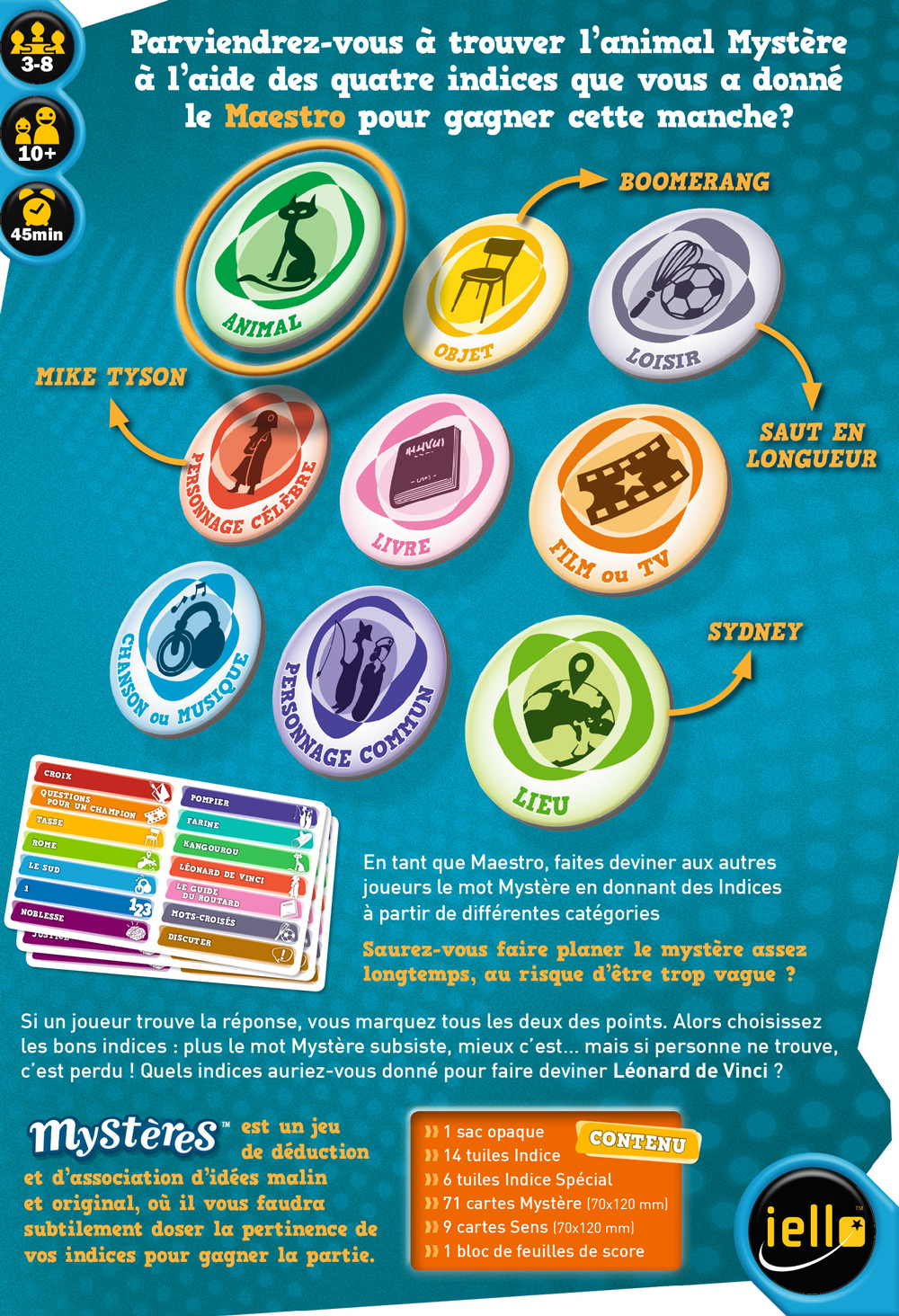 Mystère est un jeu de déduction et d’association d’idées malin et original, où il vous faudra subtilement doser la pertinence de vos indices pour gagner la partie.