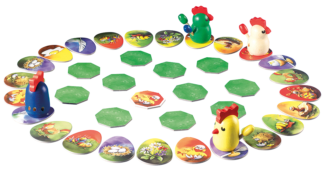 Case après case, 4 poules en bois cherchent leur chemin en retournant, au centre du parcours, la carte cachée correspondant à la case suivante. C’est une course folle, car chacun essaye de rattraper les volatiles adverses pour les déplumer ! La première poule ou le premier coq qui réussit à plumer tous les autres a gagné.