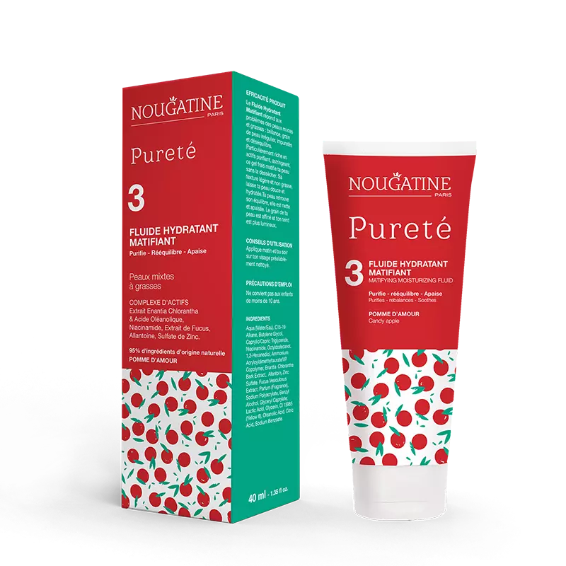 Le Fluide Hydratant Matifiant PURETÉ est un soin 3 en 1 qui hydrate, matifie et régule le sébum. Sa texture gel crème légère et non grasse, laisse la peau douce et hydratée. La peau retrouve son équilibre, elle est nette et apaisée.