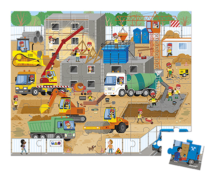 C’est parti pour une nouvelle journée sur le chantier ! Enfilez vos équipements de sécurité et rejoignez l’équipe de construction avec ce puzzle en carton de 36 pièces. Richement illustré et détaillé, ce puzzle fera le bonheur des petits fans d’engins. Une multitude de métiers y sont représentés, ce qui en fait un support très ludique. La taille des pièces est adaptée aux petites mains des enfants dès 4 ans. Un poster servant de modèle est fourni, pour assembler son puzzle à son rythme. On range toutes les pièces et on transporte facilement le jeu dans sa jolie valisette ! Ce puzzle aux couleurs vives est décoré à base d’encres végétales. C’est un puzzle fabriqué en France avec du carton FSC® mixte, qui deviendra vite le jouet préféré de votre enfant !