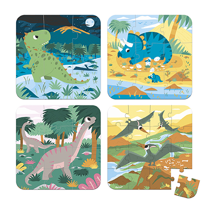 Quatre puzzles en carton sur le thème des dinosaures. Chaque puzzle à une couleur différente au dos pour aider l’enfant à retrouver les bonnes pièces. Les puzzles ont également un nombre de pièces évolutif pour l’accompagner dans sa progression : 6, 9, 12 et 16 pièces. Dimension des puzzles : 20 x 20 cm. Ce produit est composé de matériaux certifiés FSC® et de matériaux contrôlés.