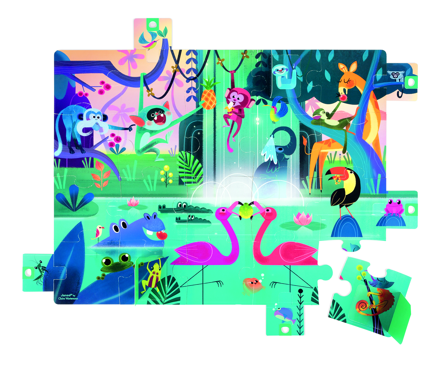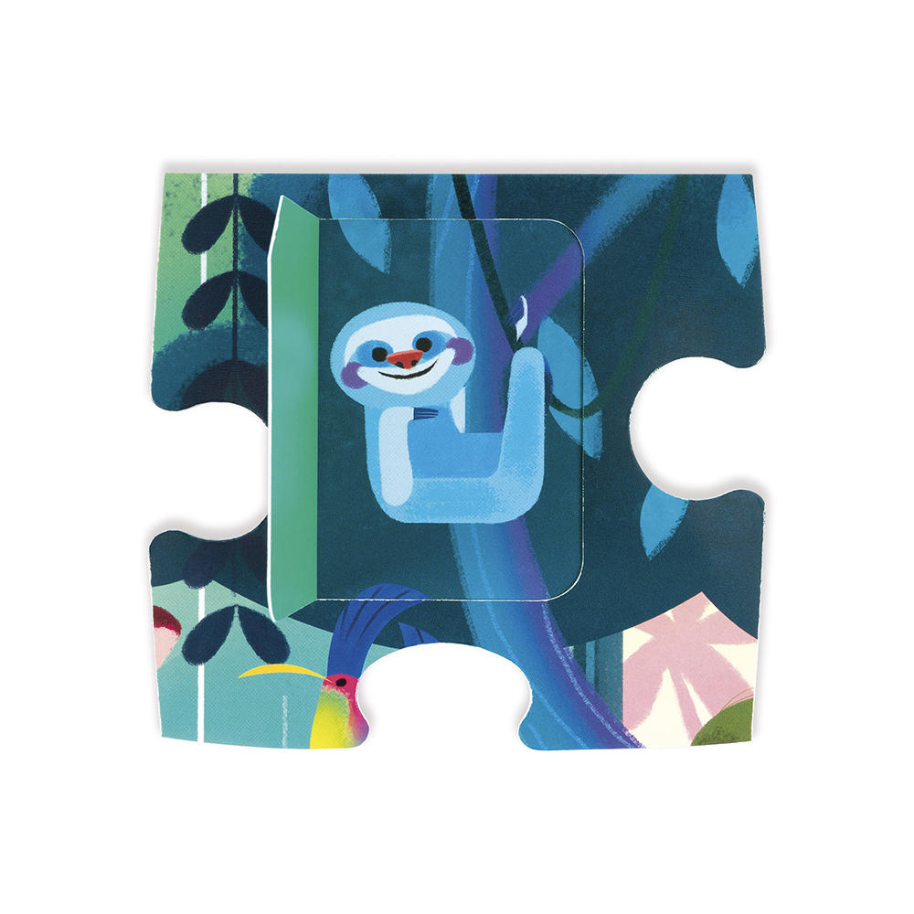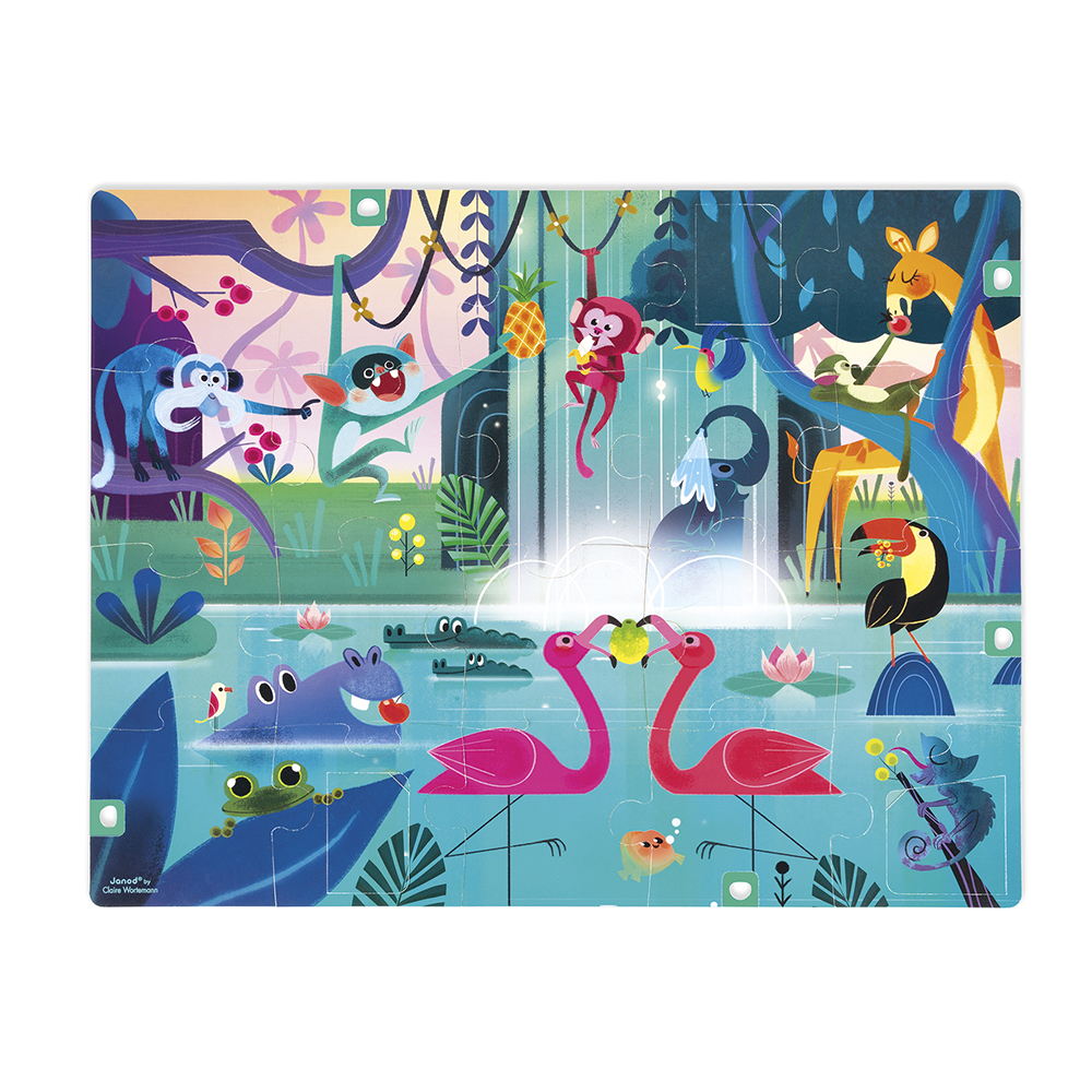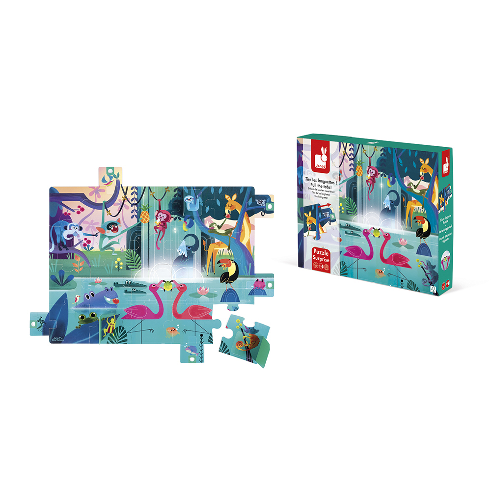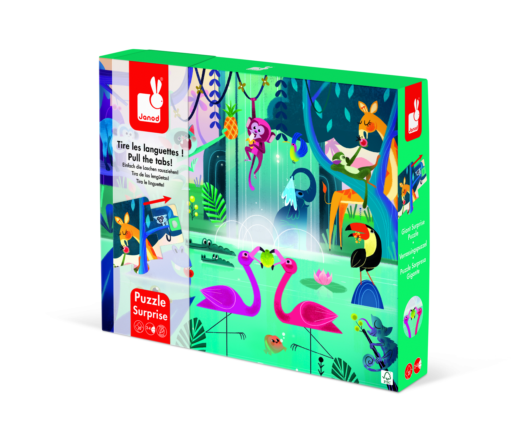 Puzzle géant de 20 pièces en carton rigide, avec 8 pièces surprises et des illustrations aux couleurs joyeuses sur le thème des animaux de la jungle ! 5 languettes à tirer pour agrandir le puzzle et 3 fenêtres à ouvrir pour découvrir pleins de surprises cachées dans les illustrations ! Contient un poster servant de modèle. Puzzle : 65 x 50 cm. Ce produit est composé de matériaux certifiés FSC® et de matériaux contrôlés.