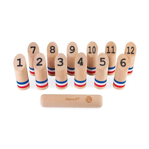 Beau jeu de 12 quilles jurassiennes au bâton en bois massif livrées avec la règle du jeu franc-comtoise. Pour jouer, il faut faire 63 points et ne pas sortir de l’aire de jeu au risque d’être éliminé. Compatible avec la règle du jeu des quilles finlandaises. Fabriqué en France.