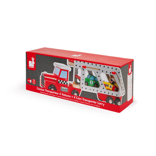 Ce joli camion en bois peut transporter jusqu’à quatre voitures Story Racing. Sa remorque peut accueillir 2 voitures sur chaque niveau. Très facile à manipuler : il suffit de tirer sur les poignées rouges pour que la rampe glisse vers l’arrière du camion et permette d’ouvrir la porte. Contient : 4 voitures Story (1 Formule 1 rouge, 1 Speed bleue, 1 Roadster verte et 1 Retromotor jaune).