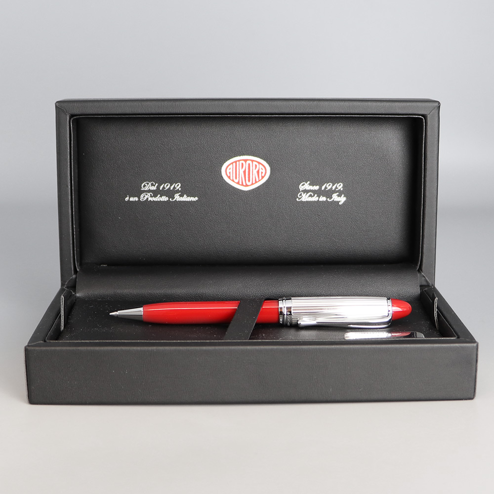 Le stylo est livré dans un coffret de luxe en similicuir noir au sigle de la fabrique Aurora et porteur d’une plaque d’authenticité.
