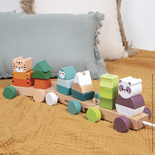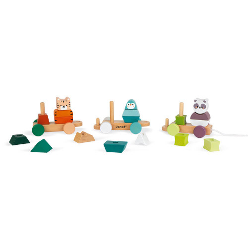 Faites place ! Nos animaux rigolos arrivent gaiement chez vous ! Le panda, le manchot et le tigre n’attendent plus que les petits pour partir en balade et aller de découvertes en découvertes ! Ce jouet d’éveil en bois est 2 en 1 : on développe d’abord sa motricité fine grâce à ces beaux wagonnets en bois naturel et aux couleurs lumineuses, à tirer grâce à la ficelle en coton, puis on s’amuse à empiler et reconstituer les 18 pièces de ce chargement très spécial. Chaque animal est associé à un symbole de son environnement, ce qui permet de donner des repères aux enfants. Ce jeu est idéal pour développer la motricité fine et l’apprentissage des couleurs à partir de 12 mois. Jouet premier âge en bois certifié FSC® (bois issu de forêts gérées durablement) et peinture à l’eau.